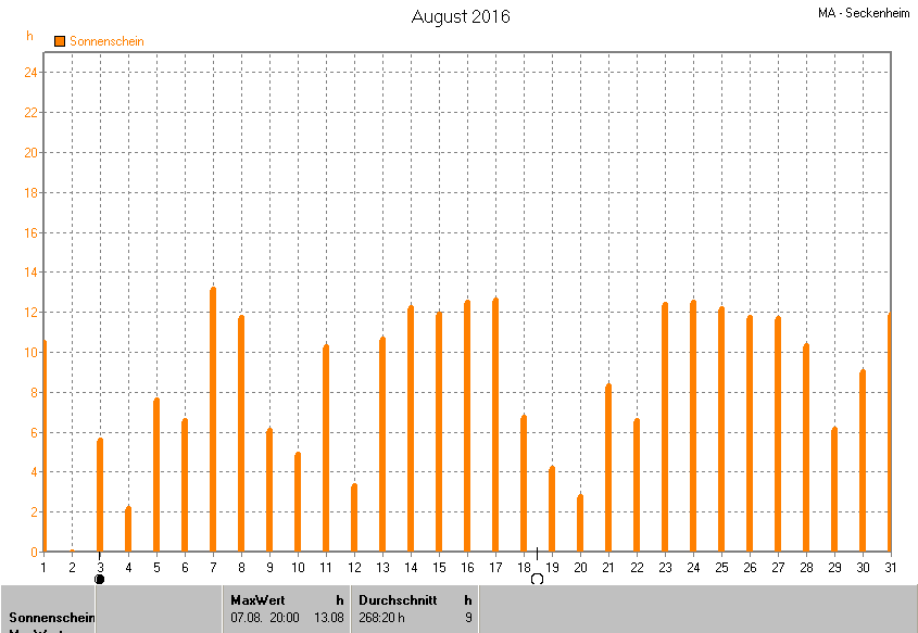 Dargestellt wird die grafische Übersicht für die Sonnenscheinzeit. Zu sehen sind immer die täglichen Sonnenstunden (von 0-24 Uhr):