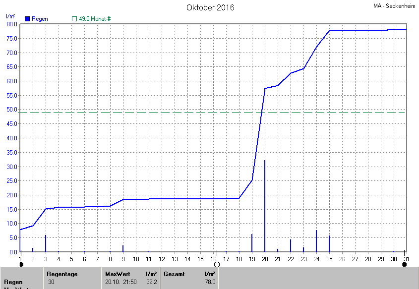 Dargestellt wird die grafische Übersicht für den Niederschlag. Zu sehen sind immer die täglichen Niederschlagsmengen (von 0-24 Uhr) und in der ansteigenden Linie die Summe aller Niederschläge: