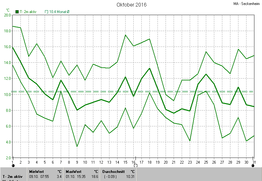 Der wärmste Tag war der 01.10.2016 um 15:35 mit 18.6°C. Am kältesten war es mit 3.4°C am 09.10.2016 um 07:55.