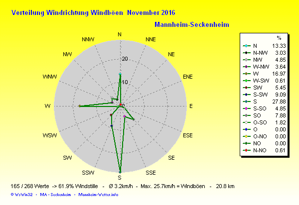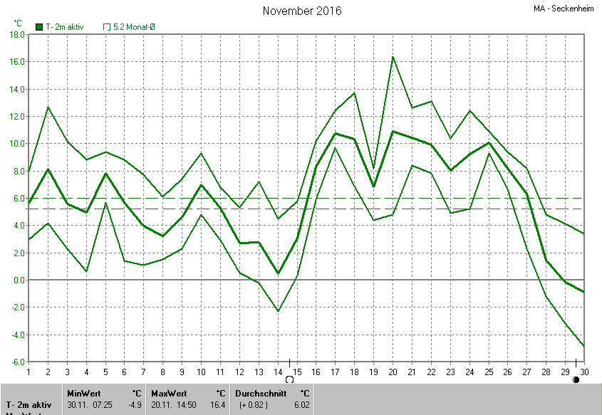 Die Durchschnittstemperatur für den Monat November 2016 lag bei 6.02°C. Die Abweichung vom langjährigen Mittel war +0.82°C.