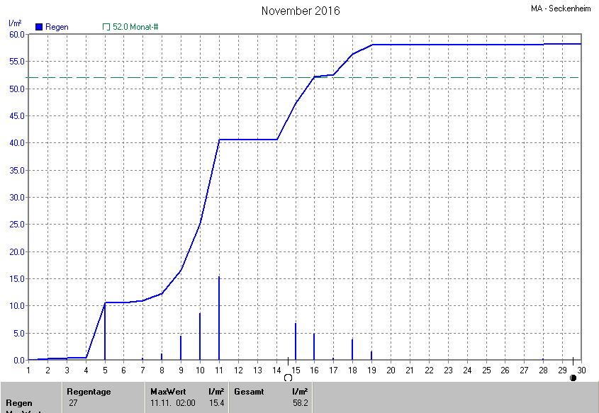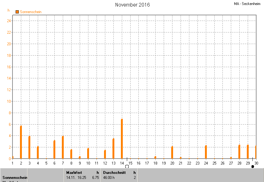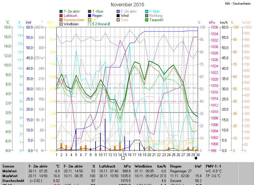 Der wärmste Tag war der 20.11.2016 um 14:50 mit 16.4°C. Am kältesten war es mit -4.9°C am 30.11.2016 um 07:25.