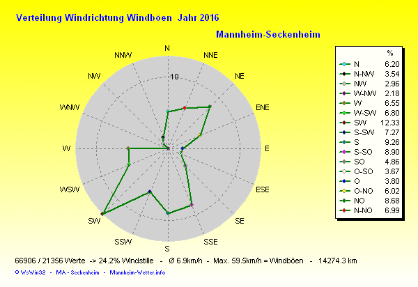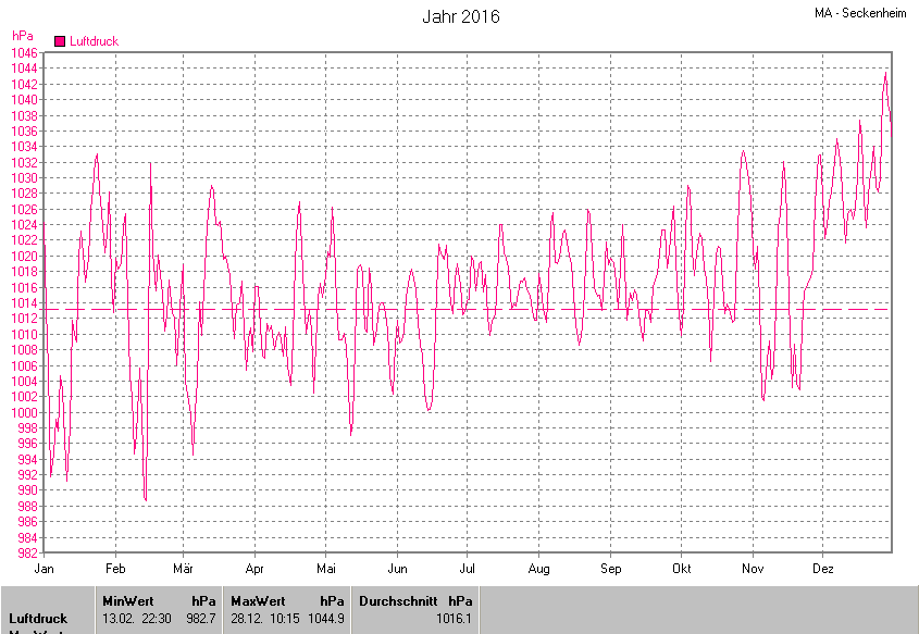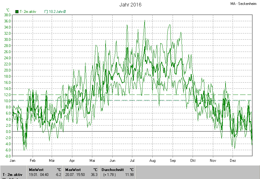 Die Durchschnittstemperatur für das Jahr 2016 lag bei 11.98°C. Die Abweichung vom langjährigen Mittel war +1.78°C.