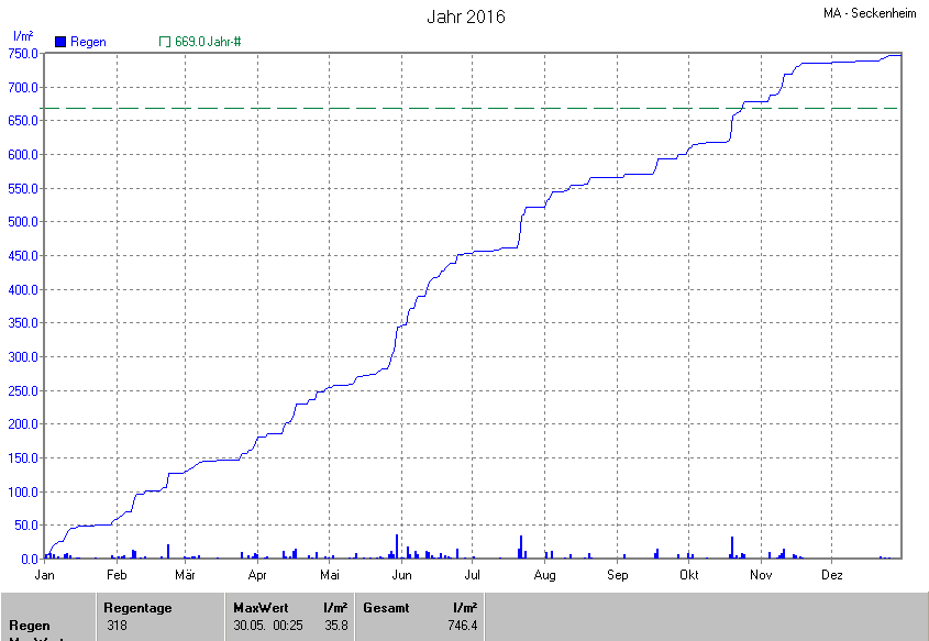 Die gesamte Regenmenge lag bei 746.4l/m² ( 111.6%) und war damit um +77.4l/m² vom langjährigen Wert entfernt. Niederschlag gab es an 178Tagen. Mehr als 2mm Regen gab es an 88Tagen. Sehr viel Regen mit mehr als 20mm pro Tag gab es an 4Tagen.