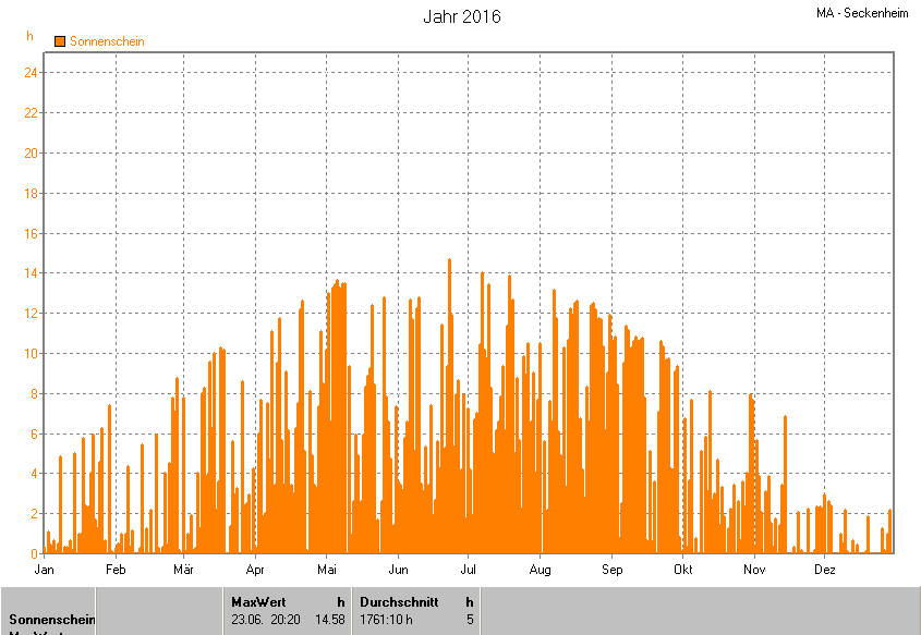 Dargestellt wird die grafische Übersicht für die Sonnenscheinzeit. Zu sehen sind immer die täglichen Zeiten (von 0-24 Uhr):