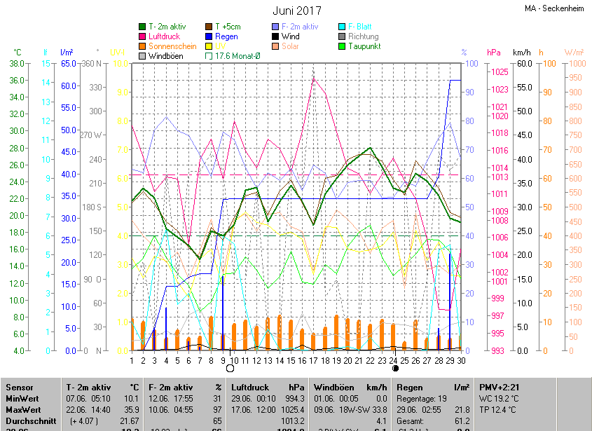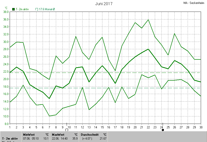 Die Durchschnittstemperatur für den Monat Juni 2017 lag bei 21.67°C. Die Abweichung vom langjährigen Mittel war +4.07°C.