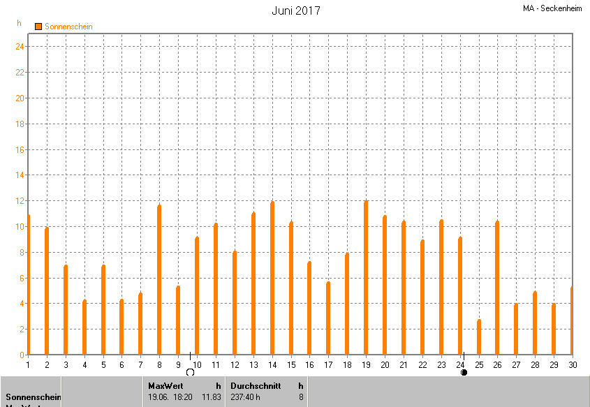 Dargestellt wird die grafische Übersicht für die Sonnenscheinzeit. Zu sehen sind immer die täglichen Sonnenstunden (von 0-24 Uhr):