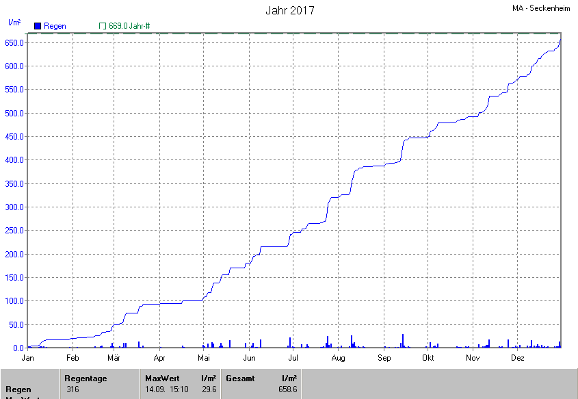 Die gesamte Regenmenge lag bei 658.6l/m² ( 98.4%) und war damit um -10.4l/m² vom langjährigen Wert entfernt. Niederschlag gab es an 170Tagen. Mehr als 2mm Regen gab es an 93Tagen. Sehr viel Regen mit mehr als 20mm pro Tag gab es an 4Tagen.