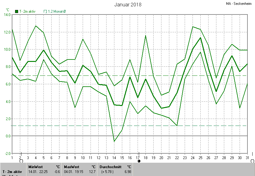 Die Durchschnittstemperatur für den Monat Januar 2018 lag bei 6.98°C. Die Abweichung vom langjährigen Mittel war +5.78°C.