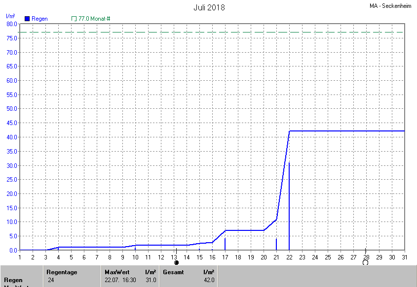Die gesamte Regenmenge lag bei 42.0l/m² (entspricht: 54.5%) und war damit um -35.0l/m² vom langjährigen Wert entfernt. Niederschlag gab es an 7Tagen. Mehr als 2mm Regen gab es an 3Tagen. Sehr viel Regen mit mehr als 20mm pro Tag gab es an 1Tagen.