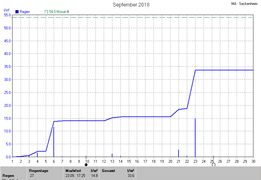 Die gesamte Regenmenge lag bei 33.6l/m² (entspricht: 62.2%) und war damit um -20.4l/m² vom langjährigen Wert entfernt. Niederschlag gab es an 10Tagen. Mehr als 2mm Regen gab es an 3Tagen. Sehr viel Regen mit mehr als 20mm pro Tag gab es an 0Tagen.
