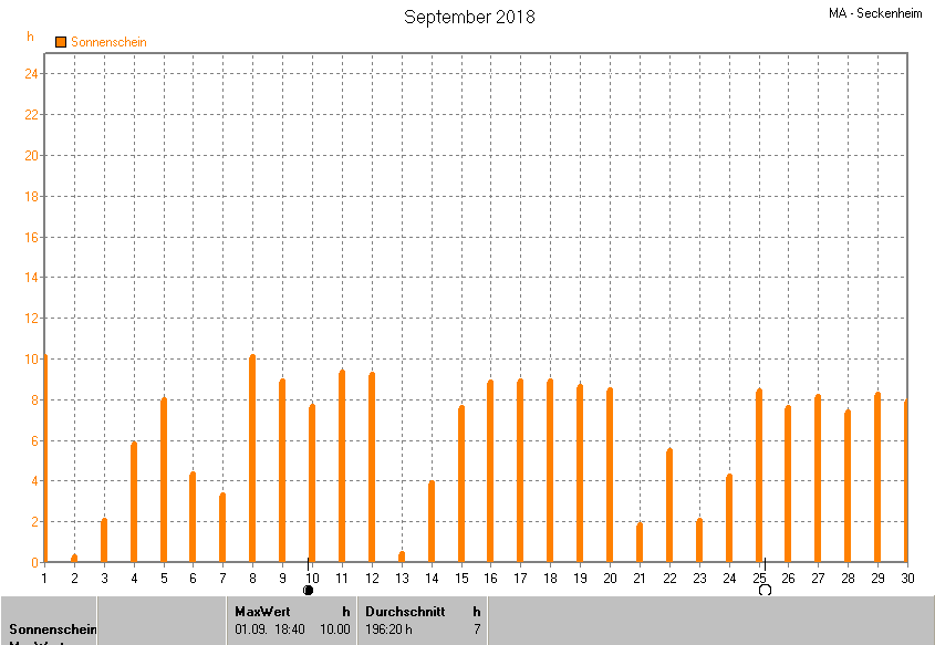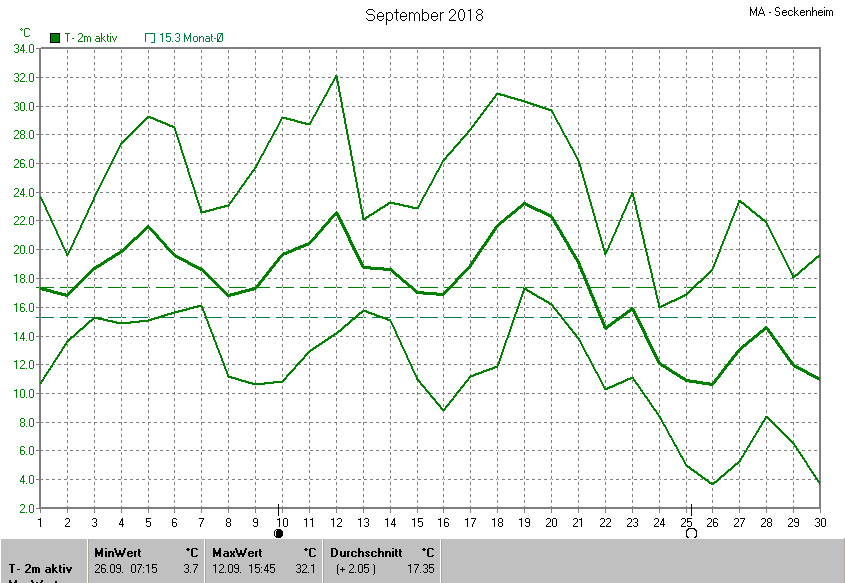 Die Durchschnittstemperatur für den Monat September 2018 lag bei 17.35°C. Die Abweichung vom langjährigen Mittel war +2.05°C.