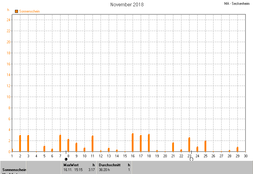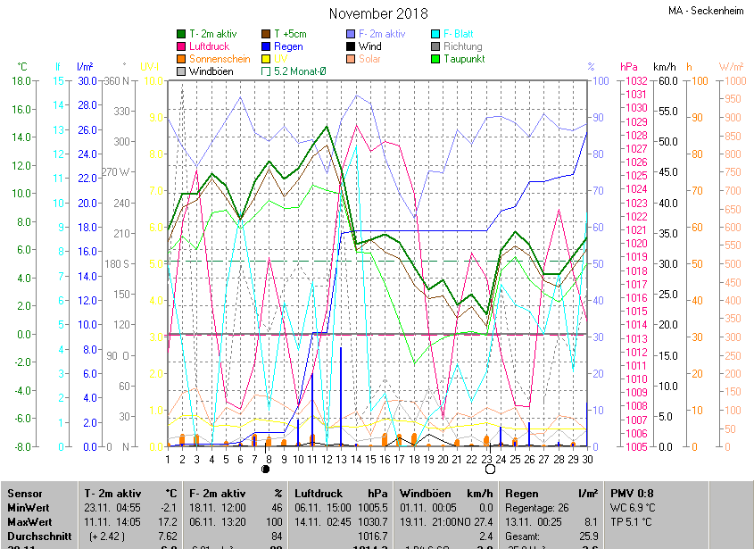 Der wärmste Tag war der 11.11.2018 um 14:05 mit 17.2°C. Am kältesten war es mit -2.1°C am 23.11.2018 um 04:55.