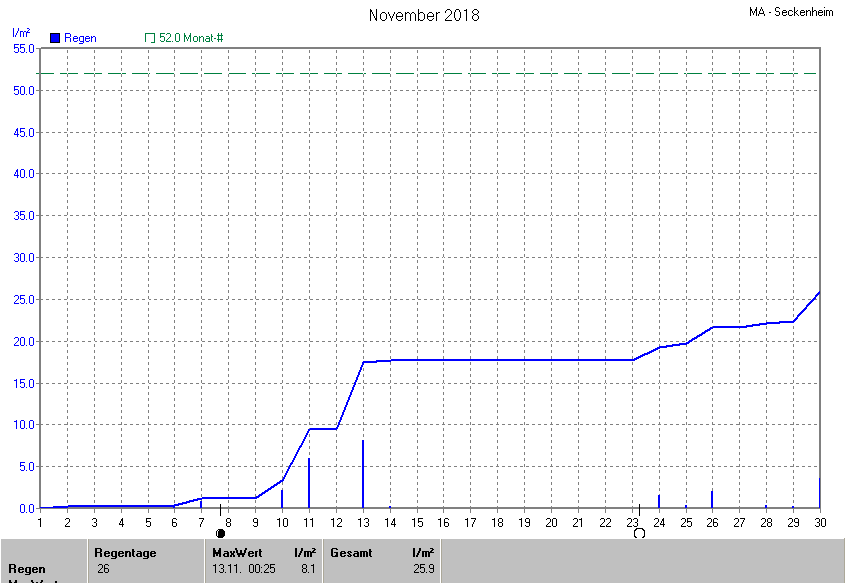 Die gesamte Regenmenge lag bei 25.9l/m² (entspricht: 49.8%) und war damit um -26.1l/m² vom langjährigen Wert entfernt. Niederschlag gab es an 13Tagen. Mehr als 2mm Regen gab es an 5Tagen. Sehr viel Regen mit mehr als 20mm pro Tag gab es an 0Tagen.