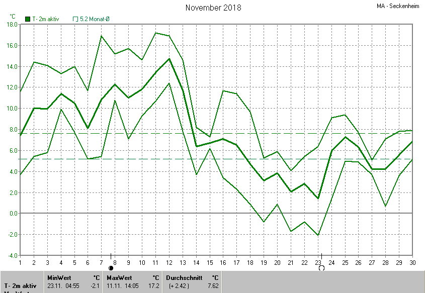 Die Durchschnittstemperatur für den Monat November 2018 lag bei 7.62°C. Die Abweichung vom langjährigen Mittel war +2.42°C.