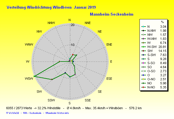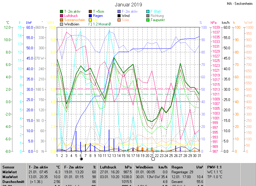 Der wärmste Tag war der 13.01.2019 um 20:35 mit 10.0°C. Am kältesten war es mit -6.3°C am 21.01.2019 um 07:45.