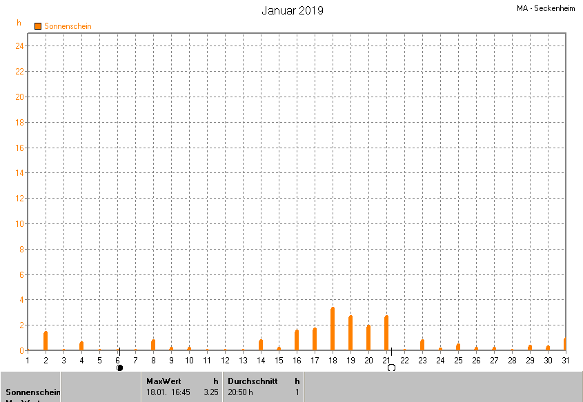 Dargestellt wird die grafische Übersicht für die Sonnenscheinzeit. Zu sehen sind immer die täglichen Sonnenstunden (von 0-24 Uhr):