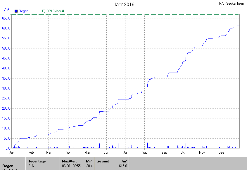 Die gesamte Regenmenge lag bei 615.0l/m² ( 91.9%) und war damit um -54.0l/m² vom langjährigen Wert entfernt. Niederschlag gab es an 179Tagen. Mehr als 2mm Regen gab es an 84Tagen. Sehr viel Regen mit mehr als 20mm pro Tag gab es an 4Tagen.