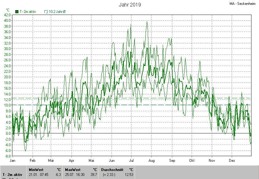 Die Durchschnittstemperatur für das Jahr 2019 lag bei 12.53°C. Die Abweichung vom langjährigen Mittel war +2.33°C.