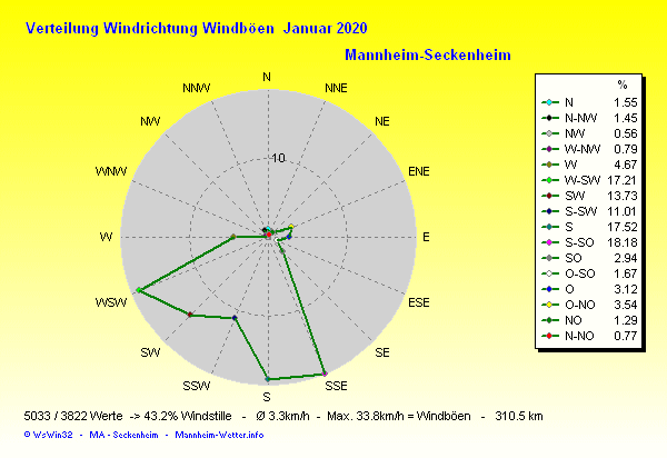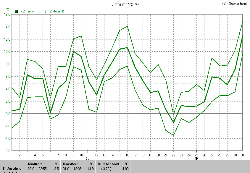 Die Durchschnittstemperatur für den Monat Januar 2020 lag bei 4.90°C. Die Abweichung vom langjährigen Mittel war +3.70°C.
