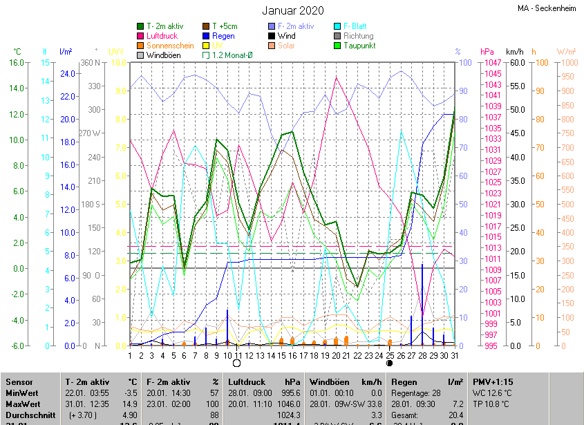 Der wärmste Tag war der 31.01.2020 um 12:35 mit 14.9°C. Am kältesten war es mit -3.5°C am 22.01.2020 um 03:55.
