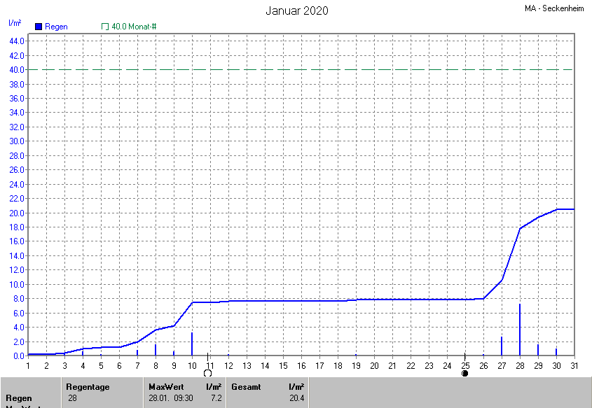 Die gesamte Regenmenge lag bei 20.4l/m² (entspricht: 51.0%) und war damit um -19.6l/m² vom langjährigen Wert entfernt. Niederschlag gab es an 15Tagen. Mehr als 2mm Regen gab es an 3Tagen. Sehr viel Regen mit mehr als 20mm pro Tag gab es an 0Tagen.