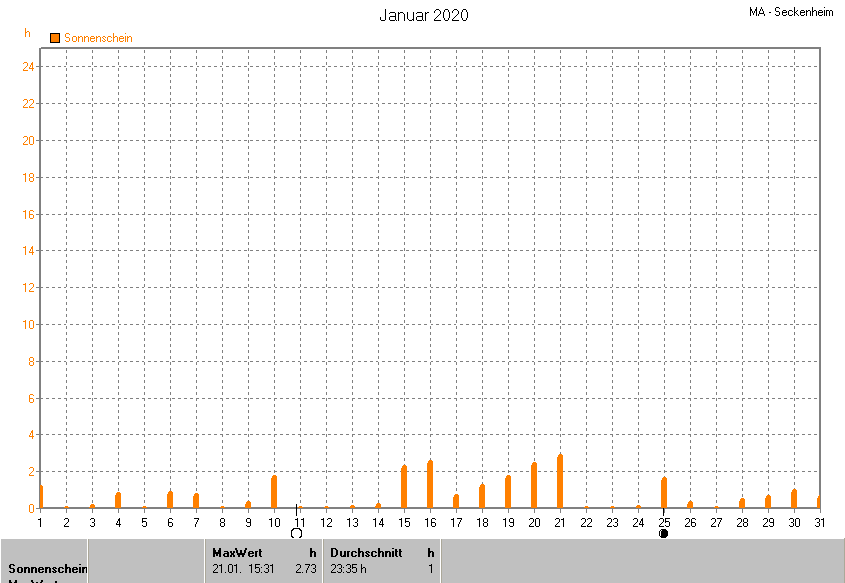 Dargestellt wird die grafische Übersicht für die Sonnenscheinzeit. Zu sehen sind immer die täglichen Sonnenstunden (von 0-24 Uhr):