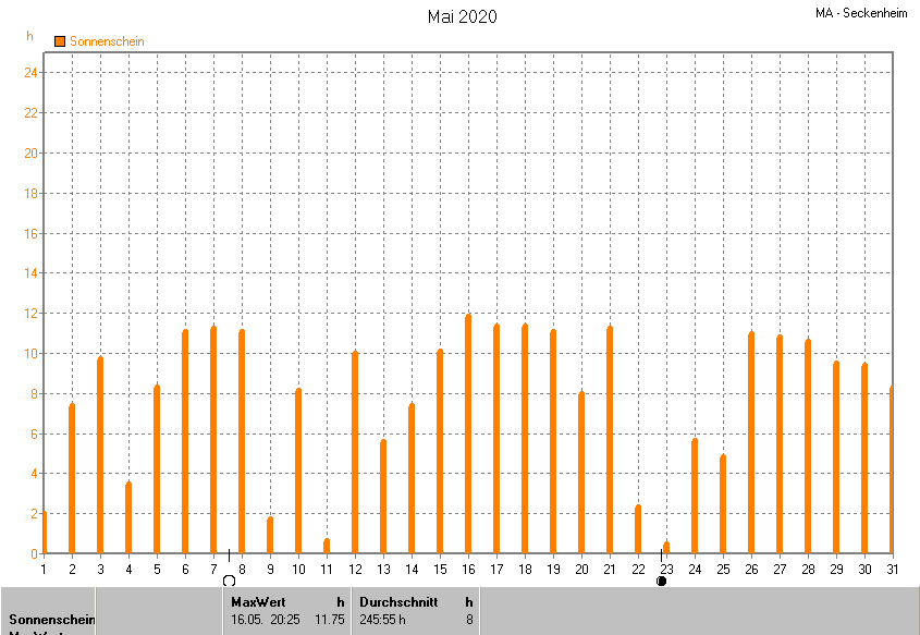 Dargestellt wird die grafische Übersicht für die Sonnenscheinzeit. Zu sehen sind immer die täglichen Sonnenstunden (von 0-24 Uhr):