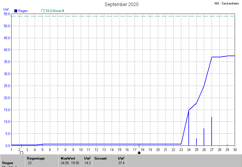 Die gesamte Regenmenge lag bei 37.4l/m² (entspricht: 69.3%) und war damit um -16.6l/m² vom langjährigen Wert entfernt. Niederschlag gab es an 7Tagen. Mehr als 2mm Regen gab es an 4Tagen. Sehr viel Regen mit mehr als 20mm pro Tag gab es an 0Tagen.
