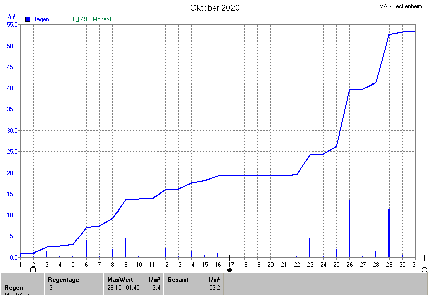 Dargestellt wird die grafische Übersicht für den Niederschlag. Zu sehen sind immer die täglichen Niederschlagsmengen (von 0-24 Uhr) und in der ansteigenden Linie die Summe aller Niederschläge: