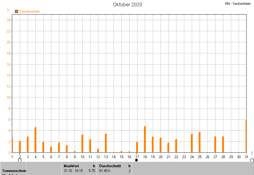 Dargestellt wird die grafische Übersicht für die Sonnenscheinzeit. Zu sehen sind immer die täglichen Sonnenstunden (von 0-24 Uhr):