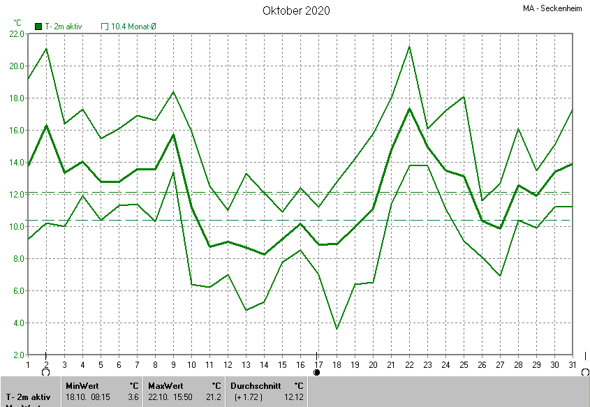 Der wärmste Tag war der 22.10.2020 um 15:50 mit 21.2°C. Am kältesten war es mit 3.6°C am 18.10.2020 um 08:15.