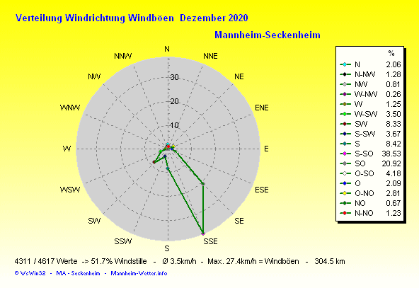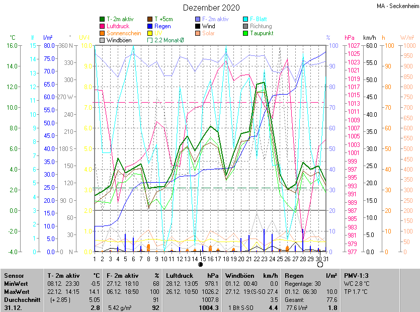 Die Durchschnittstemperatur für den Monat Dezember 2020 lag bei 5.05°C. Die Abweichung vom langjährigen Mittel war +2.85°C.