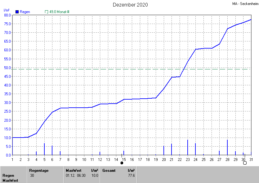 Die gesamte Regenmenge lag bei 77.6l/m² (entspricht: 158.4%) und war damit um +28.6l/m² vom langjährigen Wert entfernt. Niederschlag gab es an 26Tagen. Mehr als 2mm Regen gab es an 13Tagen. Sehr viel Regen mit mehr als 20mm pro Tag gab es an 0Tagen.