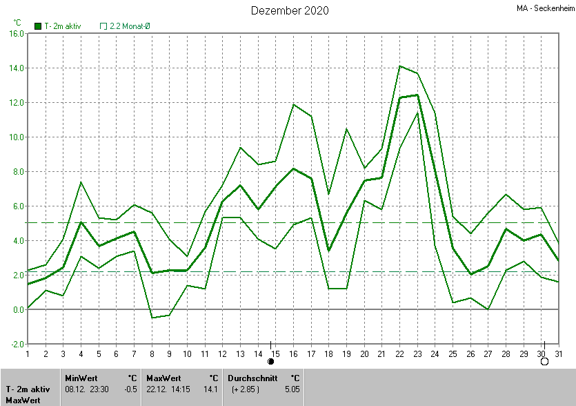 Der wärmste Tag war der 22.12.2020 um 14:15 mit 14.1°C. Am kältesten war es mit -0.5°C am 08.12.2020 um 23:30.