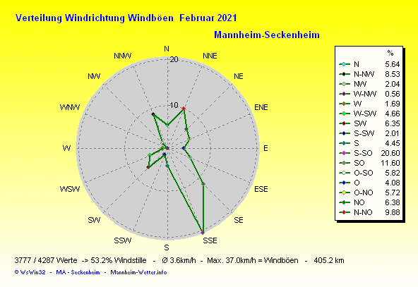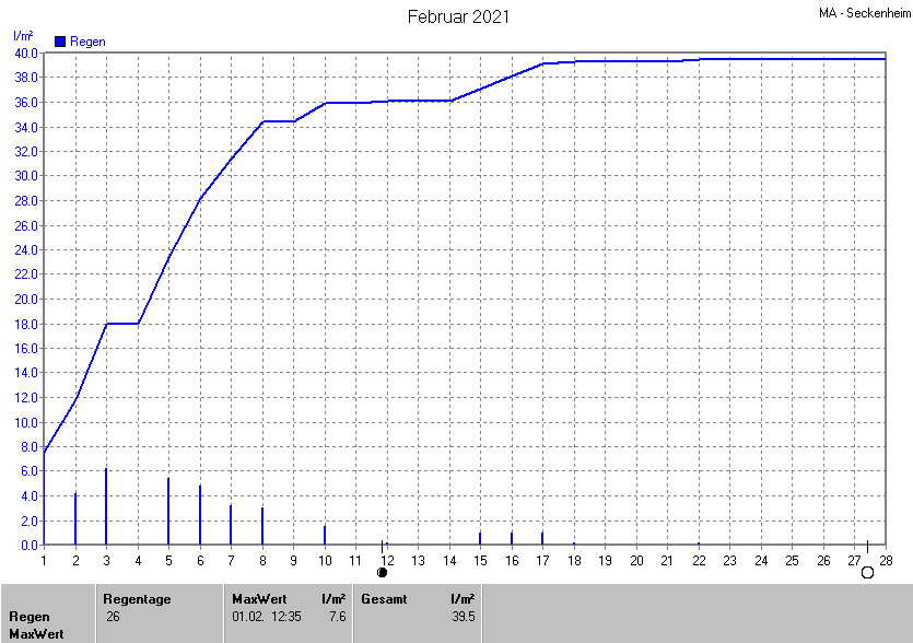 Die Durchschnittstemperatur für den Monat Februar 2021 lag bei 4.92°C. Die Abweichung vom langjährigen Mittel war +2.42°C.