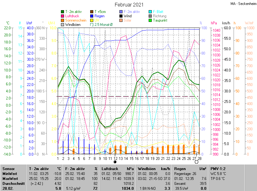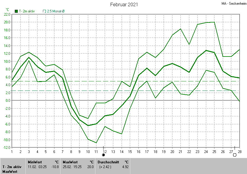 Der wärmste Tag war der 25.02.2021 um 15:25 mit 20.0°C. Am kältesten war es mit -10.8°C am 11.02.2021 um 03:25.