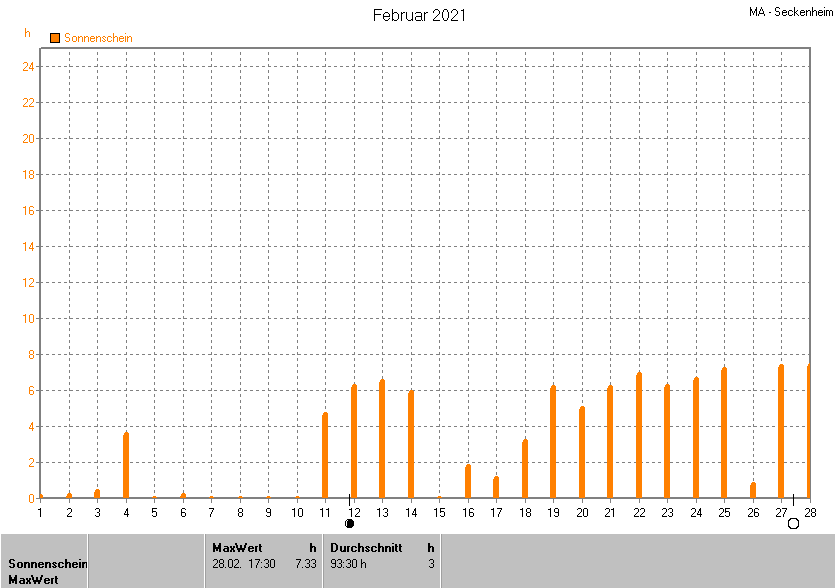 Dargestellt wird die grafische Übersicht für die Sonnenscheinzeit. Zu sehen sind immer die täglichen Sonnenstunden (von 0-24 Uhr):
