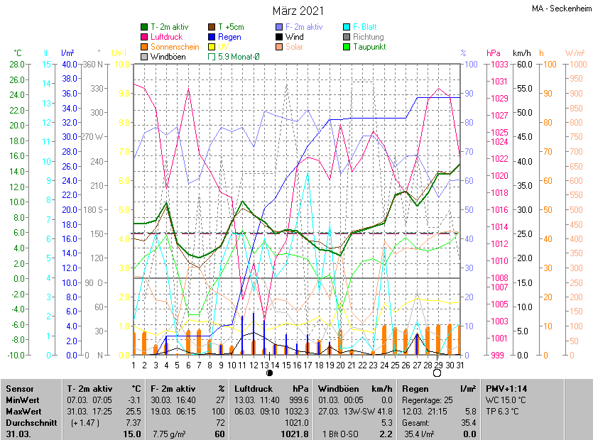 Der wärmste Tag war der 31.03.2021 um 17:25 mit 25.5°C. Am kältesten war es mit -3.1°C am 07.03.2021 um 07:05.