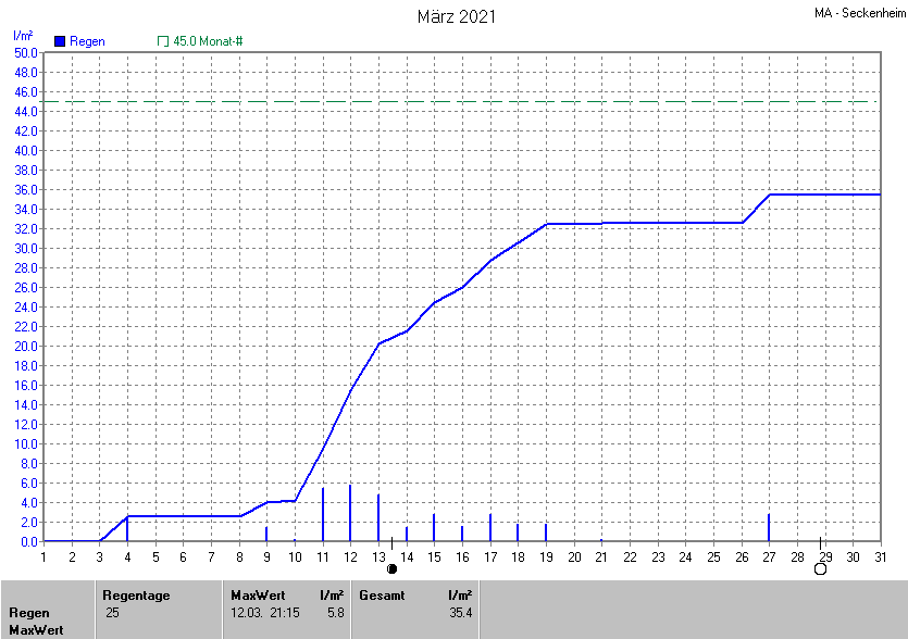 Die gesamte Regenmenge lag bei 35.4l/m² (entspricht: 78.7%) und war damit um -9.6l/m² vom langjährigen Wert entfernt. Niederschlag gab es an 14Tagen. Mehr als 2mm Regen gab es an 7Tagen. Sehr viel Regen mit mehr als 20mm pro Tag gab es an 0Tagen.