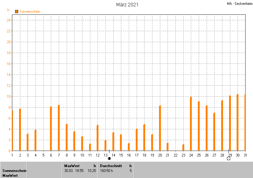 Dargestellt wird die grafische Übersicht für die Sonnenscheinzeit. Zu sehen sind immer die täglichen Sonnenstunden (von 0-24 Uhr):