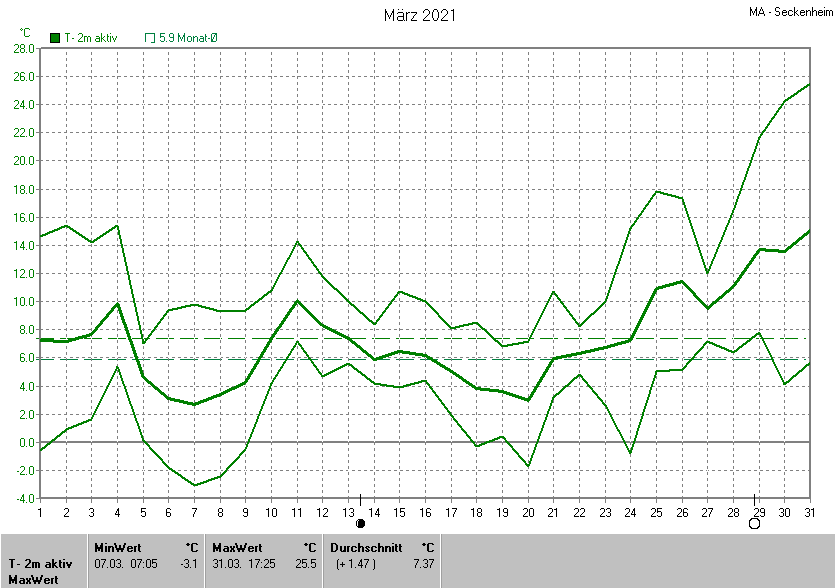 Die Durchschnittstemperatur für den Monat März 2021 lag bei 7.37°C. Die Abweichung vom langjährigen Mittel war +1.47°C.