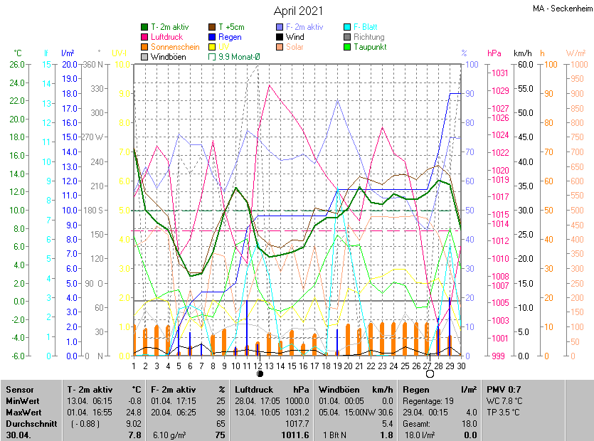 Die Durchschnittstemperatur für den Monat April 2021 lag bei 9.02°C. Die Abweichung vom langjährigen Mittel war -0.88°C.
