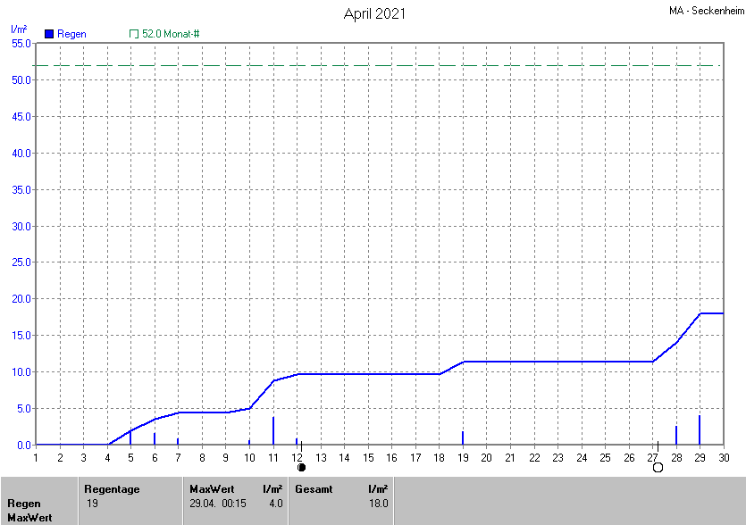 Die gesamte Regenmenge lag bei 18.0l/m² (entspricht: 34.6%) und war damit um -34.0l/m² vom langjährigen Wert entfernt. Niederschlag gab es an 9Tagen. Mehr als 2mm Regen gab es an 4Tagen. Sehr viel Regen mit mehr als 20mm pro Tag gab es an 0Tagen.