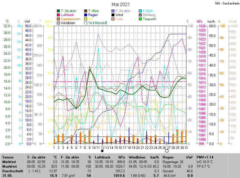 Der wärmste Tag war der 09.05.2021 um 16:25 mit 30.5°C. Am kältesten war es mit 3.9°C am 08.05.2021 um 02:55.