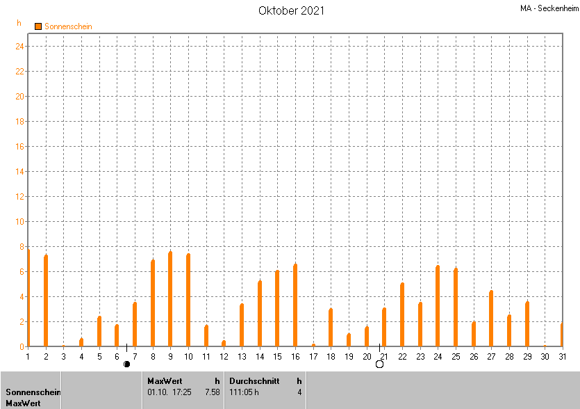 Dargestellt wird die grafische Übersicht für die Sonnenscheinzeit. Zu sehen sind immer die täglichen Sonnenstunden (von 0-24 Uhr):