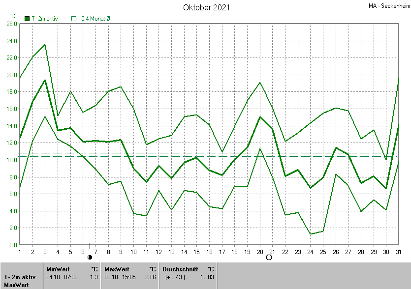 Der wärmste Tag war der 03.10.2021 um 15:05 mit 23.6°C. Am kältesten war es mit 1.3°C am 24.10.2021 um 07:30.