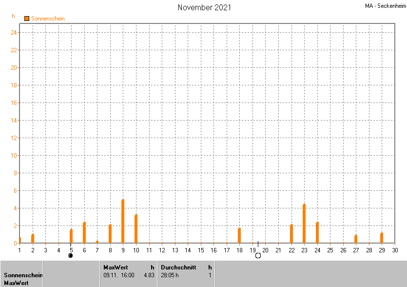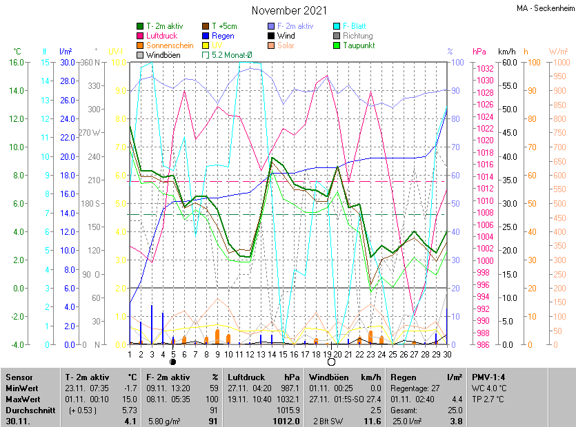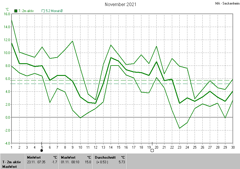 Die Durchschnittstemperatur für den Monat November 2021 lag bei 5.73°C. Die Abweichung vom langjährigen Mittel war +0.53°C.