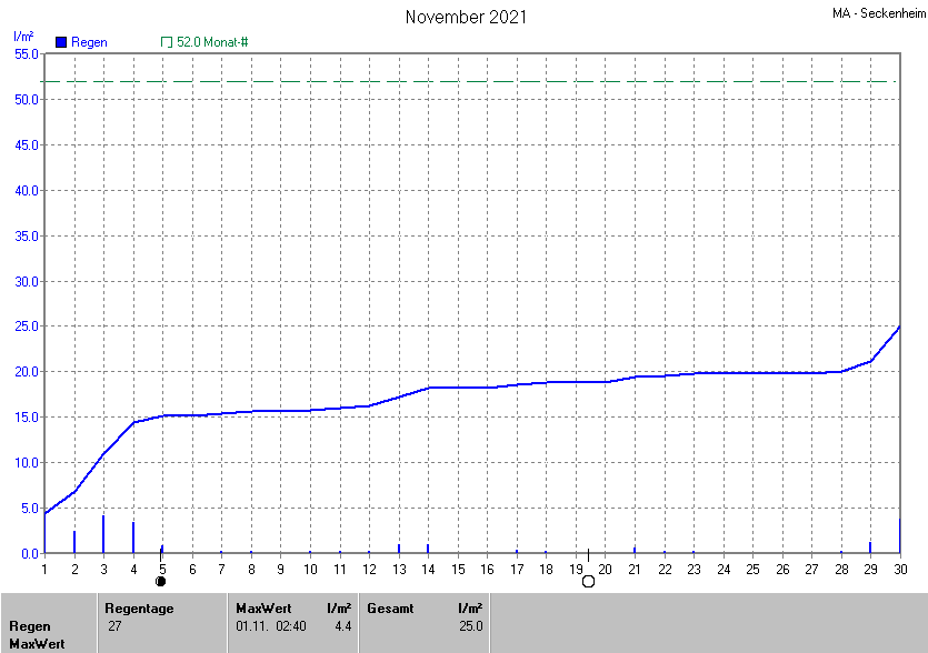 Die gesamte Regenmenge lag bei 25.0l/m² (entspricht: 48.1%) und war damit um -27.0l/m² vom langjährigen Wert entfernt. Niederschlag gab es an 20Tagen. Mehr als 2mm Regen gab es an 5Tagen. Sehr viel Regen mit mehr als 20mm pro Tag gab es an 0Tagen.