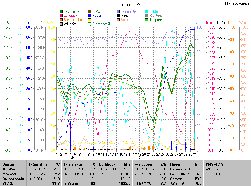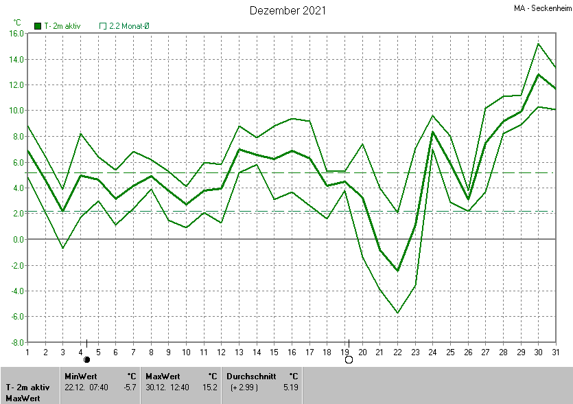 Der wärmste Tag war der 30.12.2021 um 12:40 mit 15.2°C. Am kältesten war es mit -5.7°C am 22.12.2021 um 07:40.