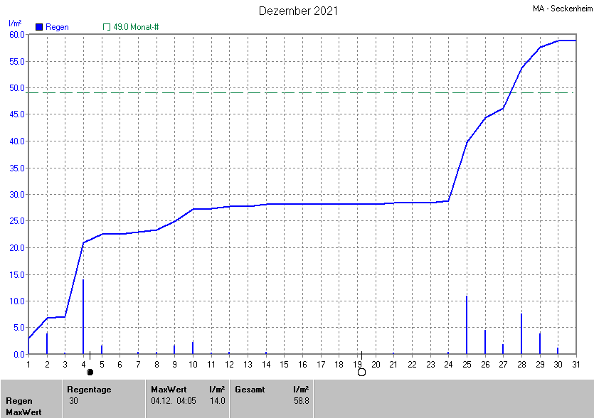 Die gesamte Regenmenge lag bei 58.8l/m² (entspricht: 120.0%) und war damit um +9.8l/m² vom langjährigen Wert entfernt. Niederschlag gab es an 20Tagen. Mehr als 2mm Regen gab es an 8Tagen. Sehr viel Regen mit mehr als 20mm pro Tag gab es an 0Tagen.